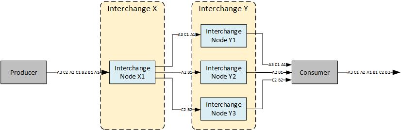 However, the interchange is currently unaware of "in-order" contexts of the produced data streams that allow messages from streams A, B and C to be mixed across different endpoints. This creates a risk that messages from 1 data stream can come through out-of-order in consumer Y