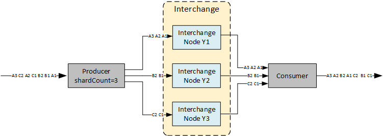 • Producer X sends the messages to the interchange with 3 nodes and specifies which messages belong to the same shard