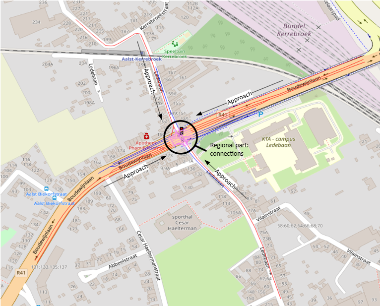 The next figure shows an example of reference point(trafficlight synbol), approaches, ingress(red), egress(blue) and connections(purple):