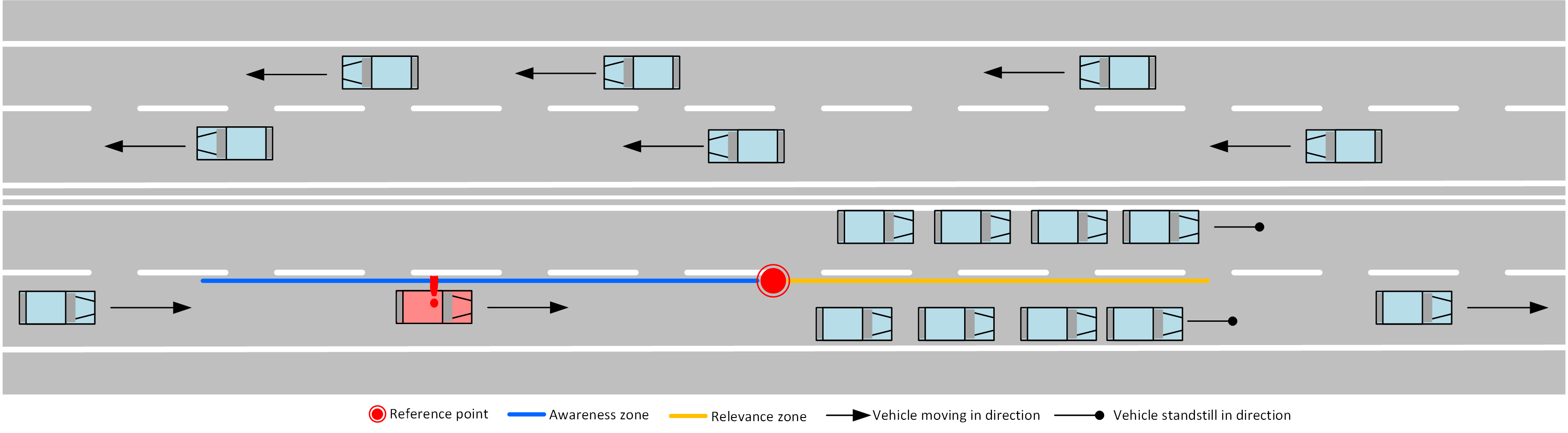 UpstreamThe vehicle, upstream of the traffic jam (red vehicle in figure), receives a notification of traffic jams on its route and is informed about the location and distance to the traffic jam.