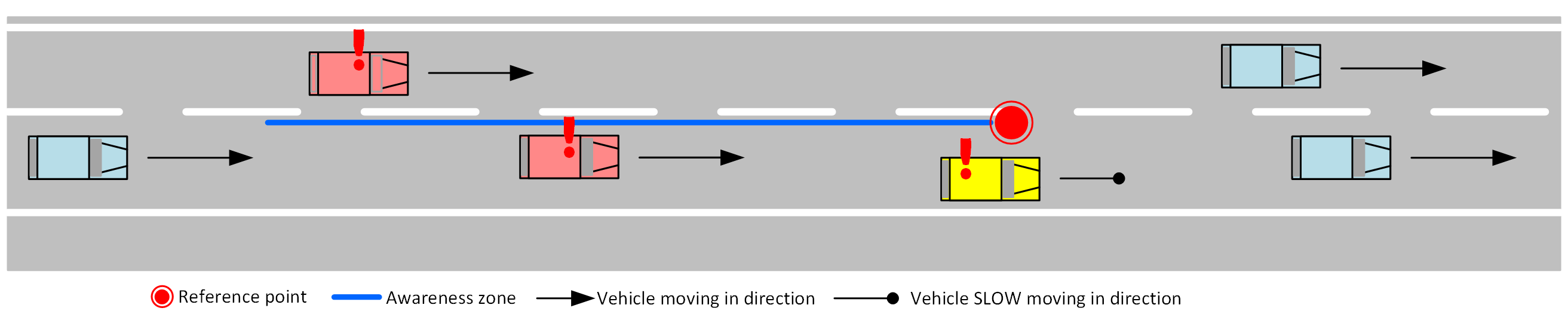 - Other traffic will be warned when entering the awareness zone in the message (red vehicles in above figure).