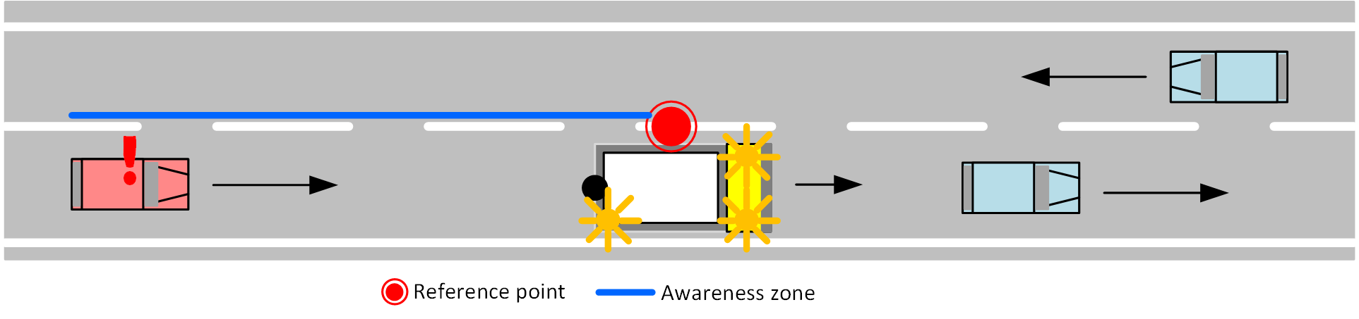 The messages made for this use case are for registered service/maintenance vehicles like gritter vehicles, which are driving without the protection of crash absorber(s). The service/maintenance vehicles will offer their position and status in a constant updated stream. Upstream vehicles will get warning messages ("active maintenance vehicle") for all present registered service/maintenance vehicles. Due to limited endangerment, there is no downstream warning. (In awareness traces)